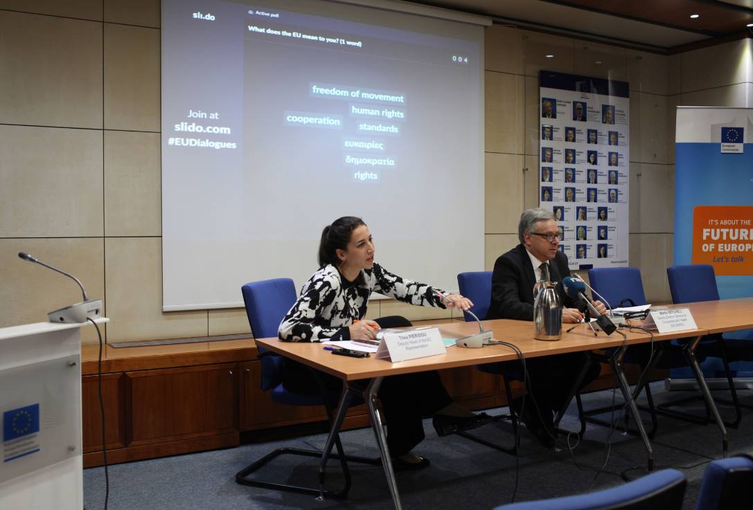 On Friday 5 April, the EC Rep organised a Citizens' Dialogue at the EU House with Mr Martin Seychell , Deputy Director General responsible for Health. The dialogue focused extensively on the challenges that the EU is facing in its effort to improve the problems in the health sector and ways to deal with these challenges and problems.The lively discussion with the citizens also focused around the importance of the prevention and early detection, cross-border implications and the need for collective action to develop structures for the prevention of serious and rare diseases. "If we detect people at a very early stage, we already know for many types of cancers that the likelihood of recovery is very good," Mr Seychell stated.Participants were also interested to hear how the EU is supporting Cyprus and can further support Cyprus within the European Semester process with more investment in the field of Health.Stressing the importance of the dialogue, Mr Seychell noted that this is a very important time as the EU needs to see what "we should do more, better, differently, and this is also one of the reasons I am here because I want to listen from you, what you think we should do differently."