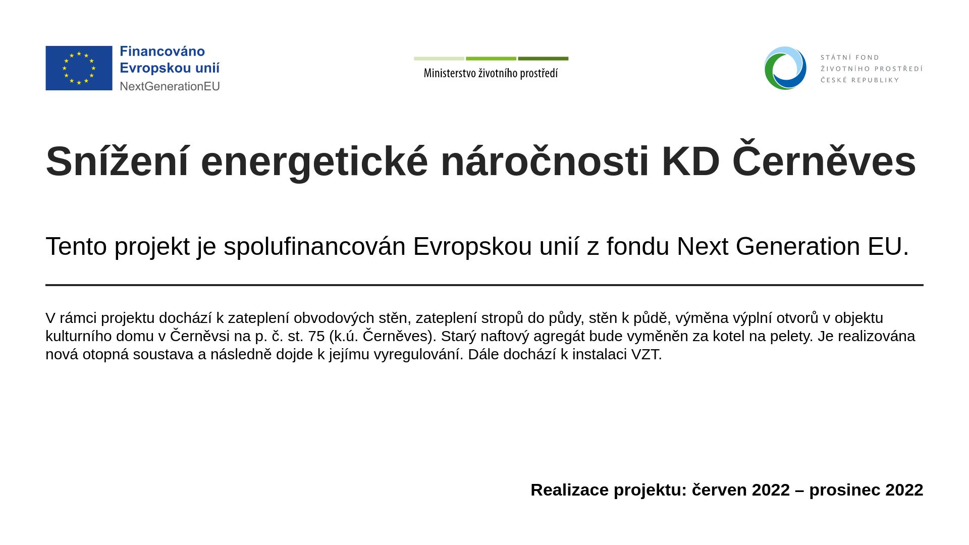 Copyright: Municipality of Černěves The municipality of Černěves has joined the National Recovery Plan (NPO) program with the aim of modernizing its cultural center and reducing its energy consumption. This project brings not only financial savings, but also a significant improvement in comfort for visitors and a more sustainable operation of the building.The main objective of the project was to reduce energy consumption and improve the energy efficiency of the cultural center building through several key measures, including:Thermal insulation of the external walls, roof and floorReplacement of windows and doors with modern energy-saving optionsInstallation of a new heating system using renewable energy sourcesThe implementation of these measures brings a significant reduction in the energy consumption of the building and the associated reduction in operating costs.Up to 50% energy savings expected (compared to the previous state)Reduction of greenhouse gas emissionsIncreased comfort for visitors of the cultural centerModernization of the building and its longer lifespanThe project to reduce the energy consumption of the Černěves cultural center is another step towards a more sustainable development of the municipality and a better quality of life for its residents. With this modernization, the cultural center becomes not only more economical, but also a more pleasant place for organizing social and cultural events.Additional links:https://www.cerneves.cz/... Copyright: Ministry of Environment Copyright: Municipality of Černěves Reference2.2.I3Project locations Czechia Project websitehttps://podo.fen.cz/...
